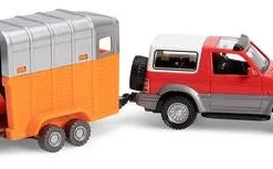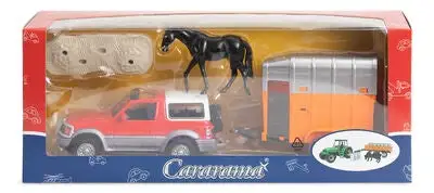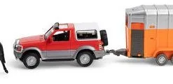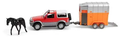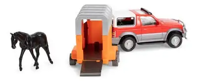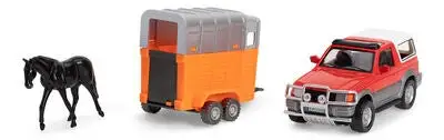 En bil med hestehenger og hest fra Alex’s Garage. Fell ned lastebryggen og la hesten gå opp i vognen, så er dere klare til å kjøre!Anbefalt alder: Fra 3 år.