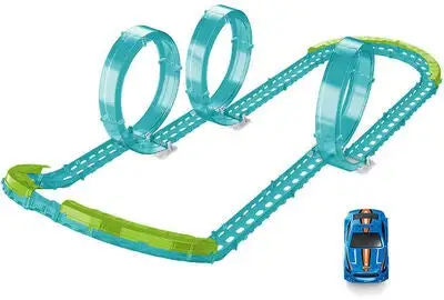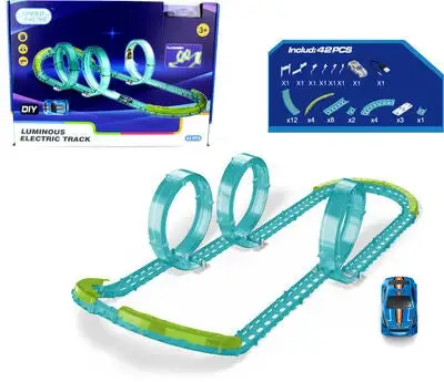 Bilbane fra Alex’s Garage med en kul selvlysende effekt. Den har en liten bil og tre looper. Bilbanen har en USB-ladekabel og 42 deler. Perfekt for mange timer med moro. – CE-merket. – Anbefalt alder: fra 3 år. – Batterier inkludert.