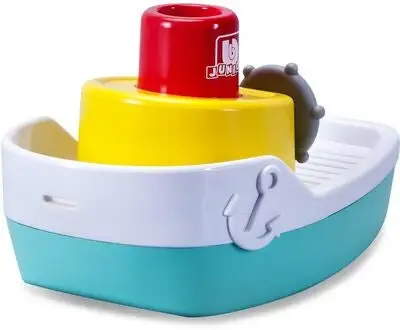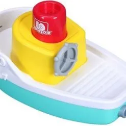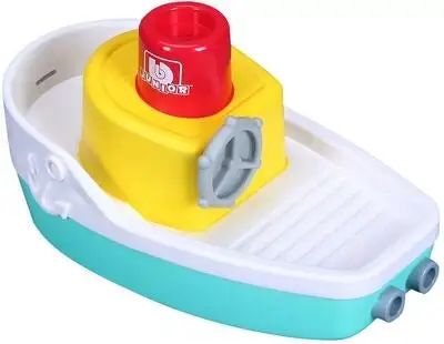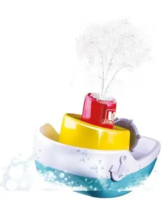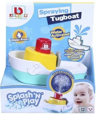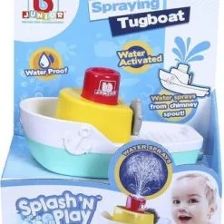 Morsom båt fra BBJunior med en skorstein som automaisk sprayer vann. Perfekt for å gjøre badestunden ekstra morsom. – CE-merket. – Anbefalt alder: fra 12 måneder. – Batteri: 2 AAA (ikke inkludert).