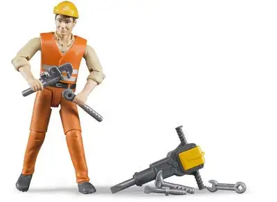 Med denne byggearbeideren med tilbehør fra Bruder er du klar for å hjelpe til der det trengs på byggeplassen. Byggearbeideren er utstyrt med byggehjelm, oransje vest, demoleringsmaskin og diverse verktøy. Arbeideren har fullt bevegelige ledd i armer, bein, midje og hode.Anbefalt alder: Fra 4 år.