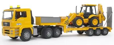 Man TGA Lastebil med gravemaskin JCB 4CX fra Bruder er en autentisk avbildning av den virkelige lastebilen. Lavlasteren brukes til å løse vanskelige transporter av store anbudsmaskiner. Gjør deg klar for å hjelpe til på byggeplassen med gravemaskinen som kan lastes på plattformen. Lastebilen har fellbar støtte, og en rampe som kan felles ut for enkelt å laste på maskinen. Med gravemaskinens førerhytte som kan roteres 360°, kan arbeid utføres til begge sider. Anbefalt alder: Fra 4 år.