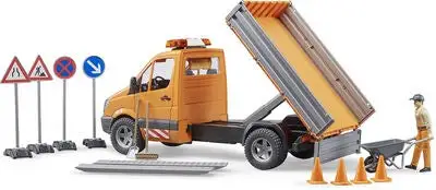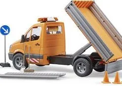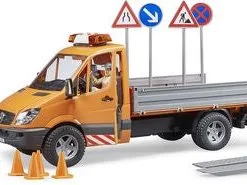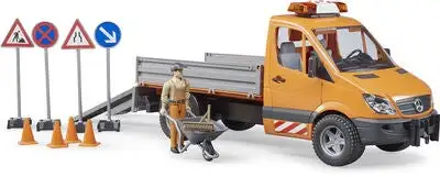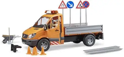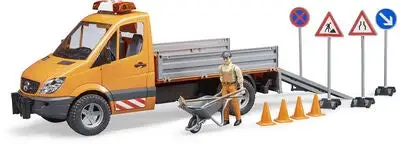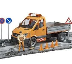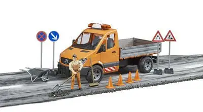 MB Sprinter Lastebil med lyd/lys inkl. arbeider og tilbehør fra Bruder. Gjør deg klar for å utføre vedlikehold på veier og fortau i din hjemkommune. Lastebilen har en helningsbar lasteplattform, og åpningsbare sideporter. I settet inngår veiskilter, trillebårer, trafikkjegler og verktøy. Sett på sirenene, og begi deg ut på oppdrag!Anbefalt alder: Fra 4 år.