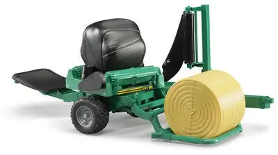 Rundballeinnplaster med to tilhørende høyballer fra Bruder. Maskinen løfter opp høyballen med hjelp av mekanismen, og sender den deretter bakover slik at den kan pakkes inn i plast. Til slutt havner høyballen på en transporthylle bak på maskinen. Kan kombineres med alle Brudertraktorer fra Profi-serien. Anbefalt alder: Fra 4 år.