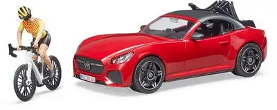 Bruder Roadster Lekebil og syklist, med naturtro detaljer. Her kan du leke at du er på sykkelferie, på jakt etter nye eventyr. Med den kule sportsbilen kan du reise lange avstander og nyte livet. Syklisten har passende klær, med sin fine hvite sykkel blir det en helt fantastisk sykkeltur. Sykling er bra for å få litt trening, eller kanskje du trener for en konkurranse? Bilen har en fin sporty rødfarge, tøffe felger og et avtakbart tak. Gi full gass og kjenn vinden i håret.