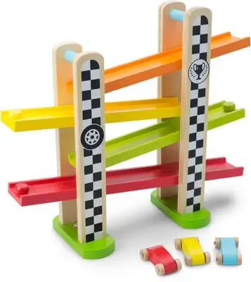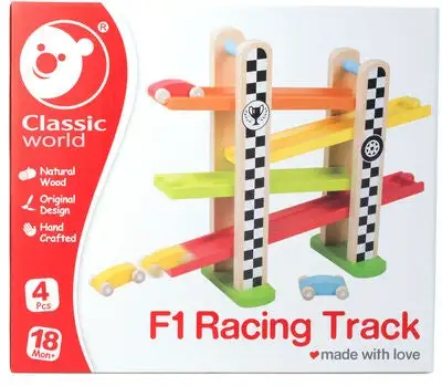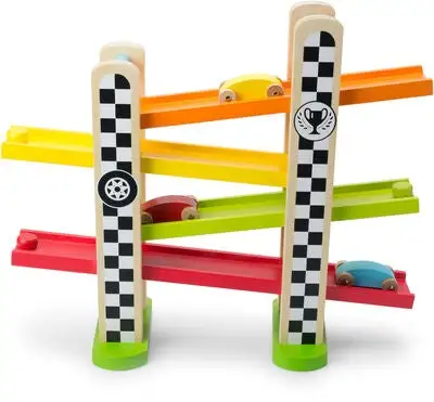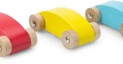 En kul bilbane i tre med tre medfølgende biler som setter nedfor banens hellende løype og suser ut på golvet!Anbefalt alder: 18 måneder +.Mål: 37 x 31,5 x 12 cm.Materiale: Tre.