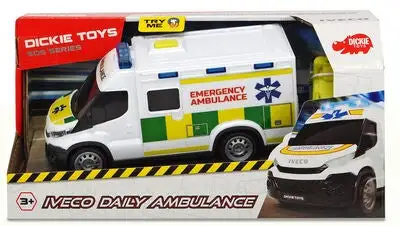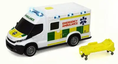 En heftig ambulanse med lyseffekter og lydfunksjoner fra Dickie Toys, som er klar til å transportere pasienter. Utstyrt med båre og bakluke som kan åpnes.