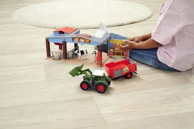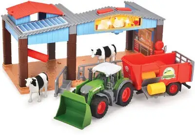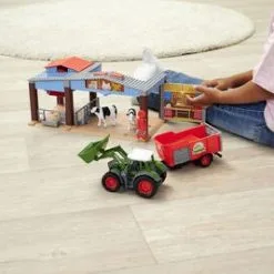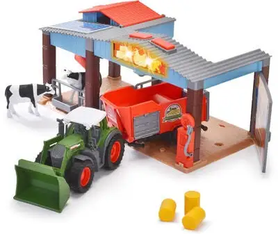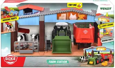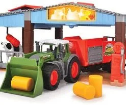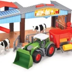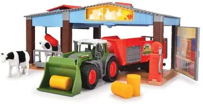 Bondegårdsstasjon fra Dickie Toys med bevegelige deler. Den har realistiske lys- og lydeffekter og en traktor med et frihjul og en tilhenger. Bondegårdsstasjonen har to kuer og tre høyballer. Perfekt for å øve opp barnets fantasi og finmotorikk. – Inneholder: 1 Bondegårdsstasjon, 1 traktor, 2 kuer, 3 høyballer. – CE-merket. – Anbefalt alder: fra 3 år. – Plast. – Batteri: 2xAAA (inkludert).
