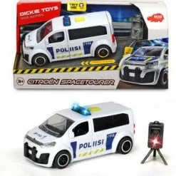 Dickie Citroën SpaceTourer Politibil med lyseffekter og lydfunksjoner er en heftig politibil, som er klar til å fange skurkene. Dørene kan åpnes, og politibilen er utstyrt med radarfelle. Bilens lyd- og lysfunksjon drives av batterier.Anbefalt alder: fra 3 år.