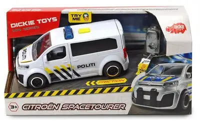Citroën SpaceTourer Politibil. En heftig politibil fra Dickie Toys, klar for å arrestere forbrytere. Politibilen har en radarfelle og dører som kan åpnes. Bilens heftige lys- og lydfunksjoner drives av batterier. Anbefalt alder: fra 3 år.