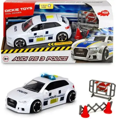 Dickie SOS Audi RS3 Politibil. En morsom lekebil med frihjul, lys og lyd, som vil gi timevis med underholdning for barna.Perfekt for bilentusiasten!Anbefalt alder: fra 3 år.