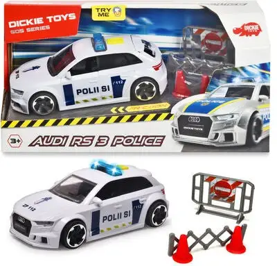 En kul finsk versjon av en Audi politibil, fra Dickie Toys. Bilen er utstyrt med friksjonsdekk, blinkende sirener og motorlyder som utløses av knapper på taket. Den har dører som kan åpnes, vinduene er tonet slik at ingen ser hvem som er arrestert. En veisperring og to kjegler er inkludert.Anbefalt alder: fra 3 år.