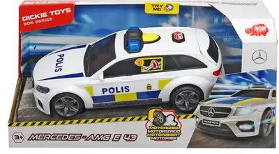 En politibil i svensk design av merket Mercedes fra Dickie Toys. Bilen er utstyrt med blinkende sirener og motorlyd som startes med hjelp av knapper på taket. Bakluken kan åpnes, vinduene er tonet slik at ingen ser hvem som er arrestert.