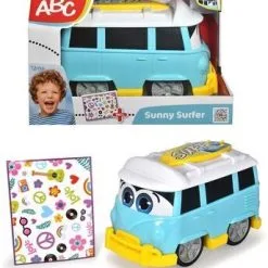 Happy Sunny Surfer Volkswagen folkebuss fra Dickie. Folkebussen har et surfebrett på taket som kan åpnes opp. Det medfølger også kreative klistremerker som du kan style med, slik at du kan sette din personlige stil på bussen. Anbefalt alder: Fra 12 måneder.