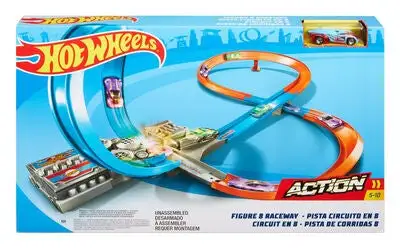 Bilbanen 8 Raceway fra Hot Wheels, med fantastiske looper og skarpe svinger som bilene må komme seg igjennom. Plasser den medfølgende bilen på startrampen, og la bilen fly avgårde langs bilbanen. Leken drives av batterier.Anbefalt alder: fra 5 år.