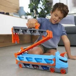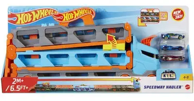 Med Hot Wheels City Speedway Hauler kan barnet ditt oppbevare sine Hot Wheels-biler med stil! Det store kjøretøyet har plass til flere enn 20 biler, og kan foldes ut til en lengde på over 2 meter. Perfekt for oppbevaring og transport av barnas alle favorittbiler!Tre Hot Wheels-biler inngår.Anbefalt alder: Fra 4 år.