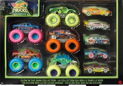 Monstertrucker fra HotWheels som lyser i mørket. Settet inneholder 5 Hot Wheels Monster Trucks og 5 Hot Wheels cars. – CE-merket. – Ikke egnet for barn under 3 år, på grunn av små deler. – Anbefalt alder: fra 3 til 12 år. – Plast.