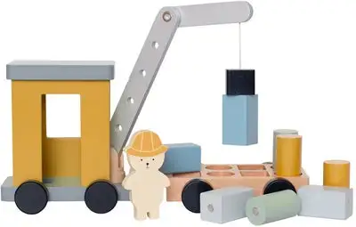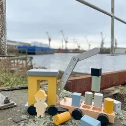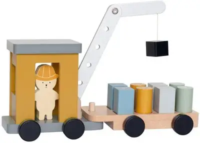 Fin kranbil fra JaBaDaBaDo i tremateriale med en roterbar kran med en magnet. Den har åtte stabile hjul og fargerike klosser. Perfekt for barn som skal trene finmotorikken! – CE-merket – Anbefalt alder: fra 1,5 år
