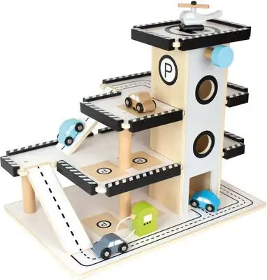 En morsom parkeringsgarasje i tre fra JaBaDaBaDo. Garasjen har 3 etasjer for biler med en rampe mellom hver etasje, og er utrustet med landingsplass for helikopter på taket, og en bensinpumpe på bakkenivå. En heis med justerbar ratt gjør at en enkelt kan kjøre bilene opp til de ulike etasjene. Tre biler og et helikopter er inkludert med garasjen. En morsom og fartsfylt lek som garantert blir en favoritt i hjemmet!Anbefalt alder: fra 2 år.Mål: 44,5 x 29,5 x 36 cm.Mål forpakning: 47 x 20 x 31 cm.Materiale: tre.