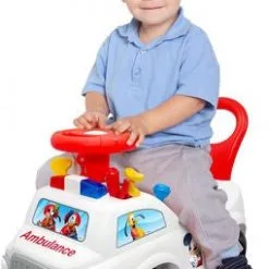 Robust, underholdende, hvit Mickey Activity ambulanse fra KiddieLand med et komfortabelt sete. Den har innebygde lydeffekter og lyseffekter. Ambulansen har Mikke Mus-motiver. – CE-merket. – Anbefalt alder: fra 12 måneder til 3 år. – Batterier inkludert.