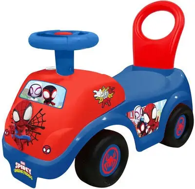 Morsom, robust, rød, blå Spiderman Spidey Team Ride gåbil fra KiddieLand med innebygde lydeffekter. Den har kule lyseffekter og et komfortabelt sete. Gåbilen har kule Spiderman-motiver. – CE-merket. – Anbefalt alder: fra 12 måneder til 3 år. – Batterier inkludert.