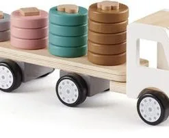 En fin stablelastebil fra Kids Concept. Trelastebilen fungerer som en stableleke, med fire pinner på tilhengeren og 14 tilhørende treringer i ulike farger. Her gjelder det å trene opp koordinasjonen, ved å stable klossene på lastebilens pinner – en morsom utfordring for barnet ditt! Klosselastebilen er morsom å leke med, samtidig som den er pedagogisk og fremmer logisk tenking, finmotorikken og gjenkjennelsen av ulike geometriske former. Anbefalt alder: Fra 12 måneder.