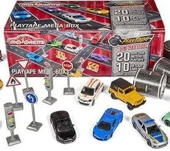 Megaboxen Playtape er en stor lekeboks med både biler og annet tilbehør. Bygg opp ditt eget samfunn med veier og skilt, så du kan kjøre rundt i ulike bydeler. 10 lekebiler 5 x 4,5 selvheftende veiteip 8 veiskilt Anbefalt alder: fra 3 år.