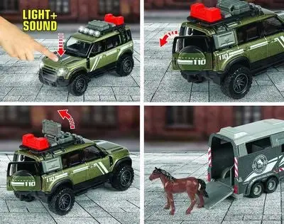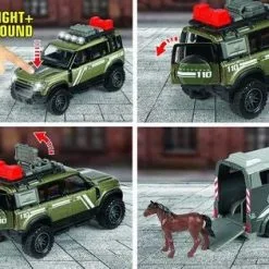 Realistisk Grand Series Land Rover fra Majorette med en hestetransport. Den har en solid metallramme med plastdeler og frittroterende gummidekk. Dette fantastiske kjøretøyet har arbeidslys og lyder, flere detaljer og bevegelige deler, som sørger for timevis av morsom lek. – Anbefalt alder: fra 3 år. – Metall, plast, gummi. – Batterier inkludert.