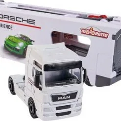 Tilbring dagen med det heftige lekesettet Porsche, fra Majorette. Lekesettet består av en lastebil med garasjeplass, hvor to kule sportsbiler fra Porsche står parkert. To biler i metall med frihjul (7,5 cm) er inkludert. Inviter vennene dine på lek og moro!Anbefalt alder: fra 3 år.