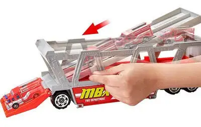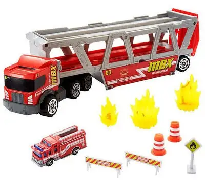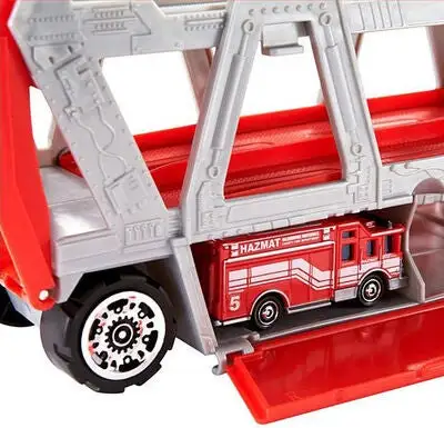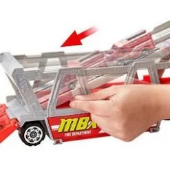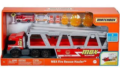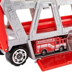 Lekesett Fire Rescue fra Matchbox med stor trailer og tilhørende brannbil. Traileren kan romme hele 16 biler (kjøpes separat). Gjennom å felle ned lasterampen lengst bak på traileren kan du enkelt kjøre bilene inn på lasteplanet. I settet får du også flere tilbehør som kan oppbevares i en kasse på traileren. Anbefalt alder: Fra 3 år.