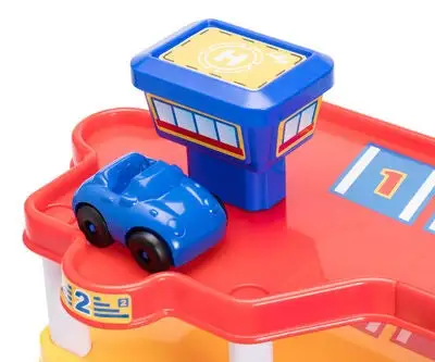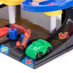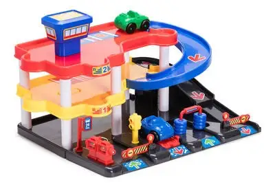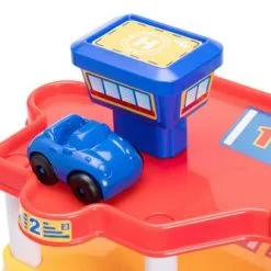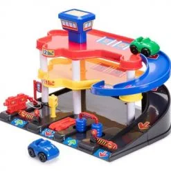 En garasje fra Redbox. Kjør bilene dine inn for å parkere, eller kjør dem ut på veiene. Garasjen har to plan og kommer med parkeringsplasser og en helikopterplattform. Du får dessuten med to biler og et trafikklys.