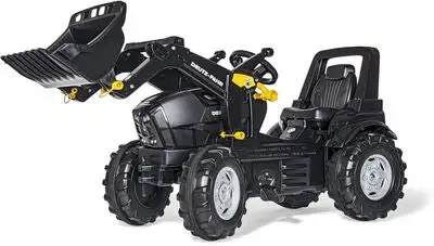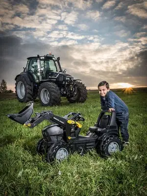 Dette er en stilig trampetraktor med frontlaster fra Rolls Toys, inspirert av Deutz Agrotron 7250 TTV WARRIOR. Bilen holder en høy kvalitet med panser som kan åpnes, justerbar pedalarm, samt robust styrestang. Setet er komfortabelt og justerbart- Et perfekt kjøretøy når du skal ut på eventyr utendørs!Anbefalt alder: 3-8 år.Mål: 146 x 52,5 x 77 cm.Vekt: 14,7 kg.Maks belastning: 50 kg.Materiale: metall, plast.Farge: svart.
