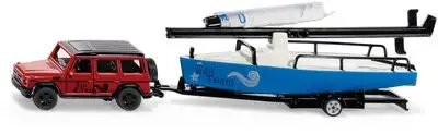 En superkul Mercedes med seilbåt, fra SIKU. Med sin V12 bi-turbo 630 HP-motor, garanterer Merceds AMG G65 superrå kjøring Alle dører kan åpnes, og reservedeler inngår, så du f.eks. kan bytte dekk i tilfelle punktering. I båthengeren transporterer du den store seilbåten på en trafikksikker måte. Masten kan enkelt slås opp når du er framme ved havet. Anbefalt alder: 3 år +.