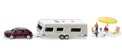 Få på deg slippersene og dra på campingferie! Personbil med husvogn fra Siku i skala 1:55. Bilen er en Porsche Cayenne, og husvognen er en Dethleff Exclusive C-motion med boggieaksler – et must-have for at vognen skal krenge mindre, og kjøre mer snabilt når du er ute på ferietur sammen med de andre bilistene. Taket på husvognen og bilens framdører kan åpnes. Parasoll, stoler, reisende og grill medfølger. Anbefalt alder: Fra 3 år.