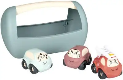 Tre biler fra Smoby med en transportboks med et praktisk håndtak. De har to små biler og en brannbil med fine detaljer. Perfekte for timer av fantasifull lek. – Mål biler: 5 x 7 cm (høyde x lengde). – CE-merket. – Anbefalt alder: fra 12 måneder. – Plast, metall.