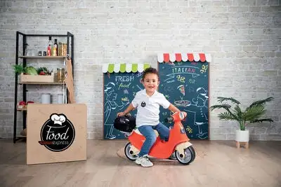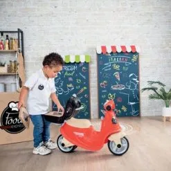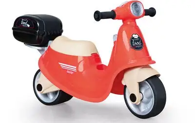 Food Express er en tøff, rød gåsykkel fra Smoby. Scooteren har en stor bagasjeboks bak, som barnet kan fylle med massevis av god mat og levere til sine kunder. Den har stillegående hjul, en virkelighetstro lykt foran, en mekanisk nøkkel og oppbevaring under setet. Tut, tut – nå drar vi!Anbefalt alder: fra 1,5 år.