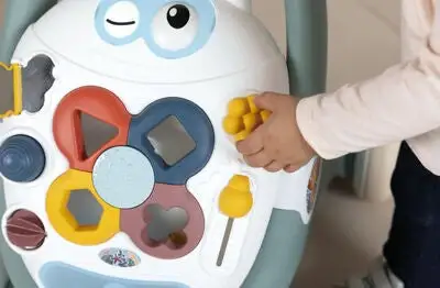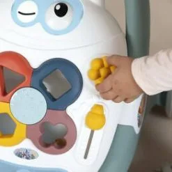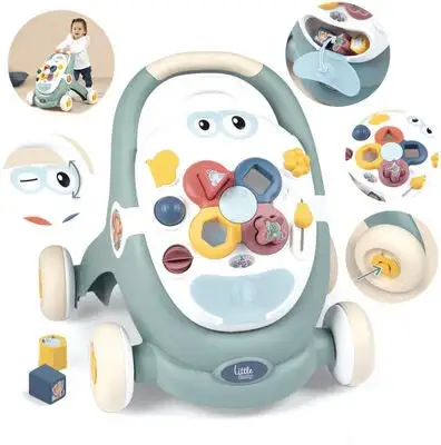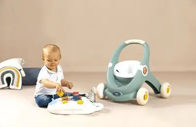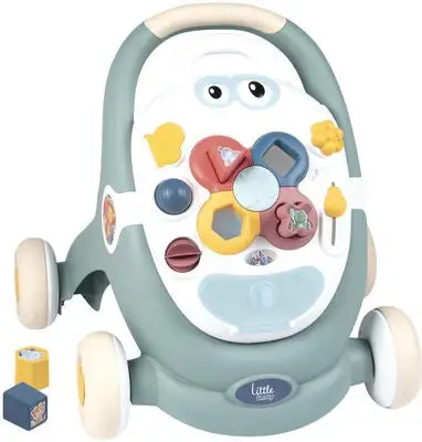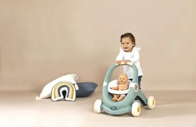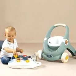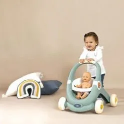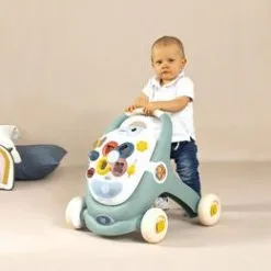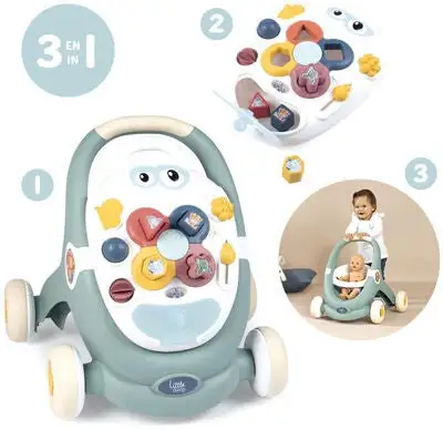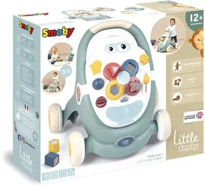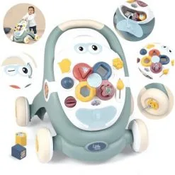 Gåvogn fra Smoby med en 3-i-1 funksjon med en gåstol, en barnevogn og et avtakbart aktivitetssenter. Den har et praktisk lagringsområde på framsiden og en puttekasse samt mange flere underholdende funksjoner på aktivitetsbordet. – CE-merket. – Anbefalt alder: fra 12 måneder. – Plast, metall.
