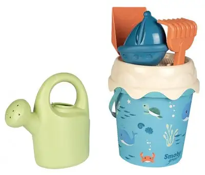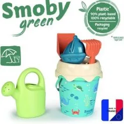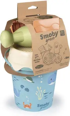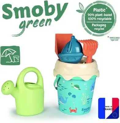Smoby Green Garnished Bucket fra Smoby er et fint lekesett til sandkassen. Dette sandkassesettet inneholder en bøtte, rive, spade, vannkanne, en sandform og en sil. Materialet i disse lekene består av 90 % plantebasert plast, laget av sukkerrør.Anbefalt alder: fra 18 måneder.