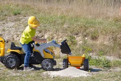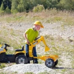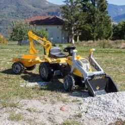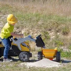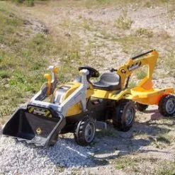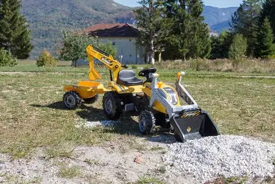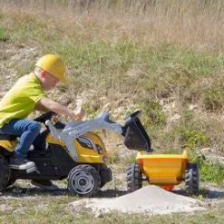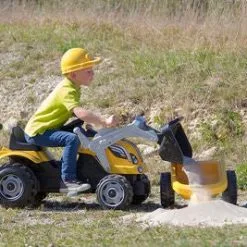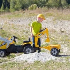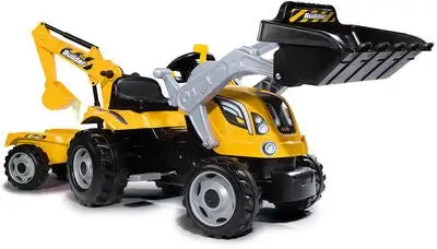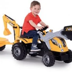 En kul trampetraktor med tilbehør fra Smoby. Traktoren har et last på framsiden, med en fungerende gravemaskin på baksiden samt et slep. Setet er justerbart, og rattet er utstyrt med et horn. En trampetraktor som du kan gjøre mange morsomme ting med! Anbefalt alder: Fra 3 år.